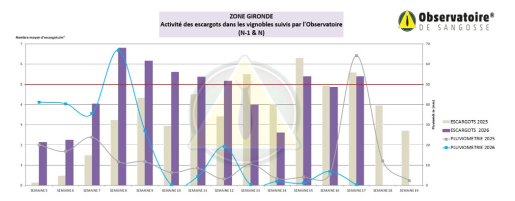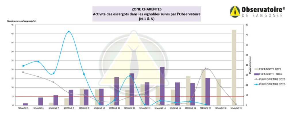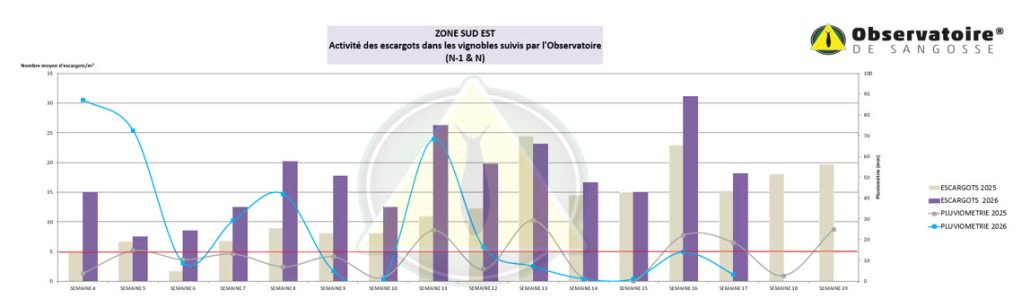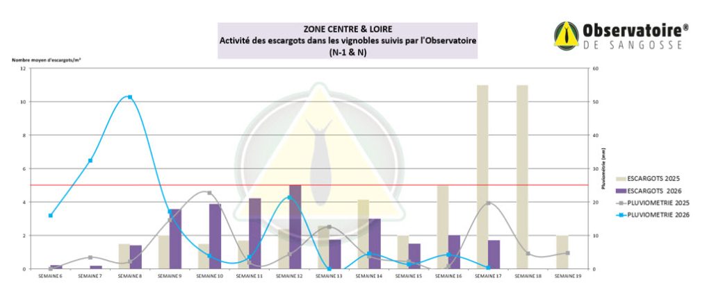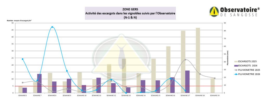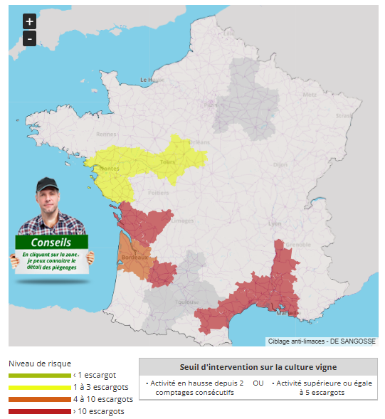 🐌 En effet, cette semaine encore, les relevés escargots transmis par les piégeurs de l’OBSERVATOIRE DE SANGOSSE montrent que toutes les zones sont au‑dessus du seuil d’intervention, à l’exception de la zone Centre & Loire.